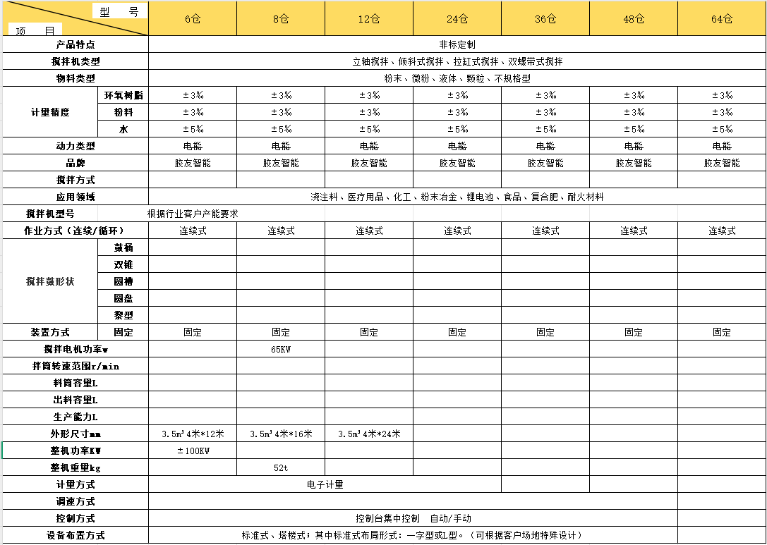 配料、搅拌、输送、 包装等电脑全自动控制,配料误差小,数据可查询,搅拌均匀、生产效率高,实现无尘化生产作业,性能稳定,质量可靠 楼式生产线:占地面积小、结构紧凑、生产效率高、模块化拼装、降低能耗